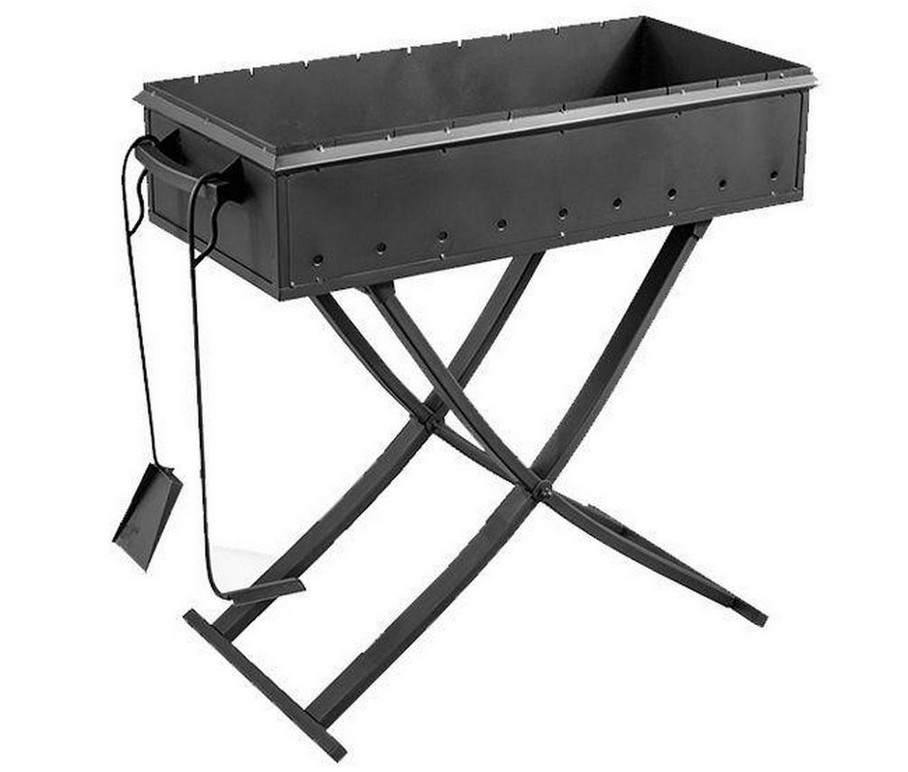 Небольшой удобный мангал со съемными опорами (ножками).  Заводского производства. При изготовлении применится жаропрочные и антикоррозийные материалы (сталь, эмаль), что обеспечивает отсутствие деформаций и длительные сроки службы.