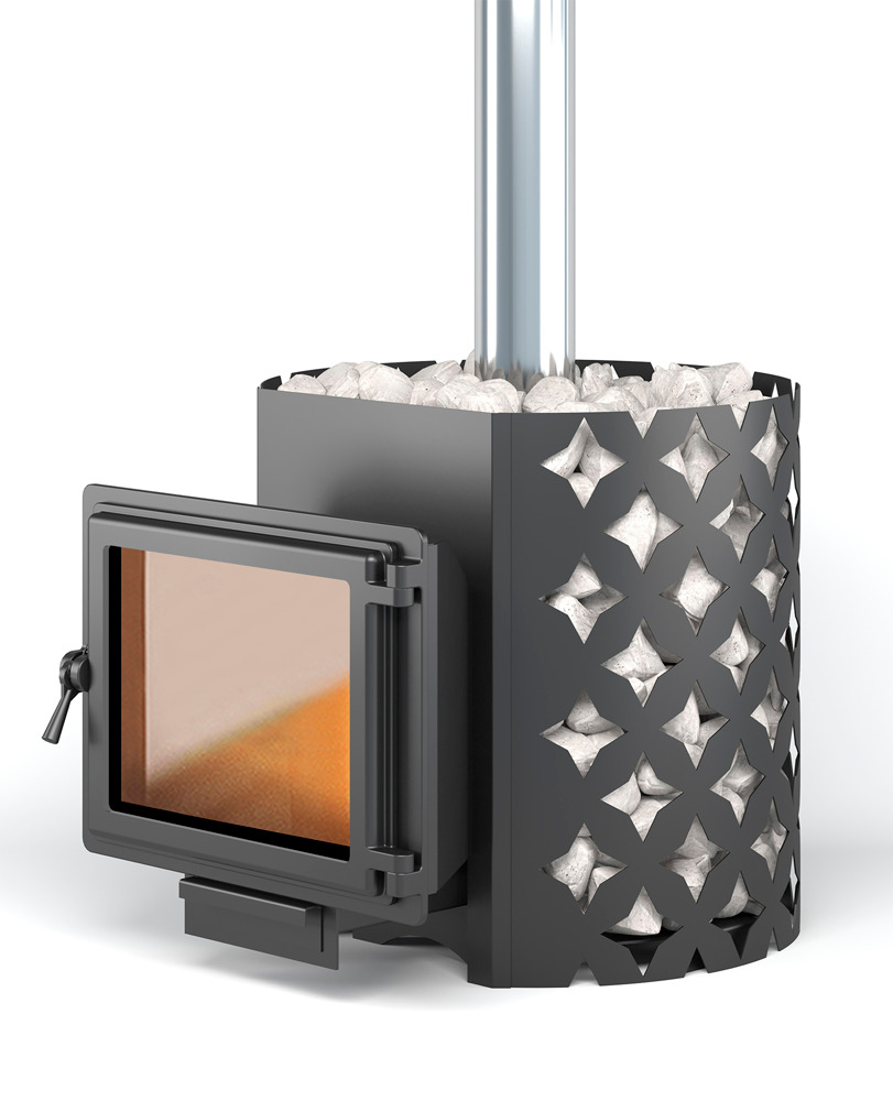 Для устройства наружной открытой каменки печь ЭТНА оснащается металлическим кожухом с прорезным рисунком оригинального дизайна. Пространство между печью и кожухом из двухмиллиметровой стали заполняется камнями для бани, которые выполняют роль теплонакопителя, перераспределяют тепло от стенок топки и защищают парящихся от жёсткого инфракрасного излучения. Воду подают на нагретые камни, с которых полученный пар распространяется по всему объёму парной.