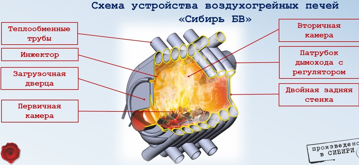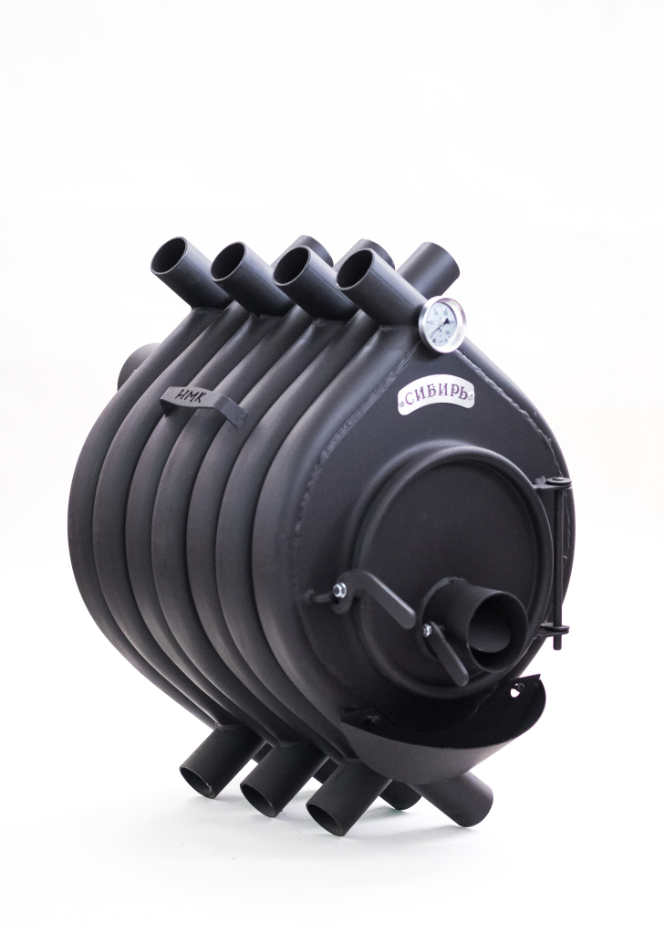 Воздухогрейная печь "Сибирь БВ" - 120 - это инновационная запатентованная модель завода "НМК". Печь представляет собой цельнометаллическую конструкцию, состоящую из многочисленных соединенных между собой металлических труб круглого сечения в количестве 7 штук, обеспечивающую естественную конвекцию, благодаря чему происходит быстрое нагревание воздуха и его плавное распределение по всему объему помещения. За основу был взят канадский отопительный аналог,  который был технически и конструкционно доработан, проверен и адаптирован под суровые условия со значительными перепадами среднегодовых температур.