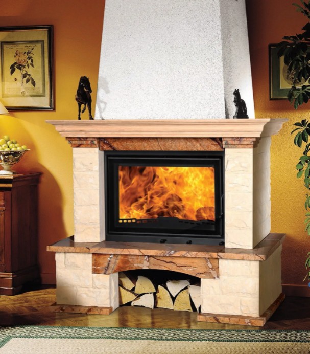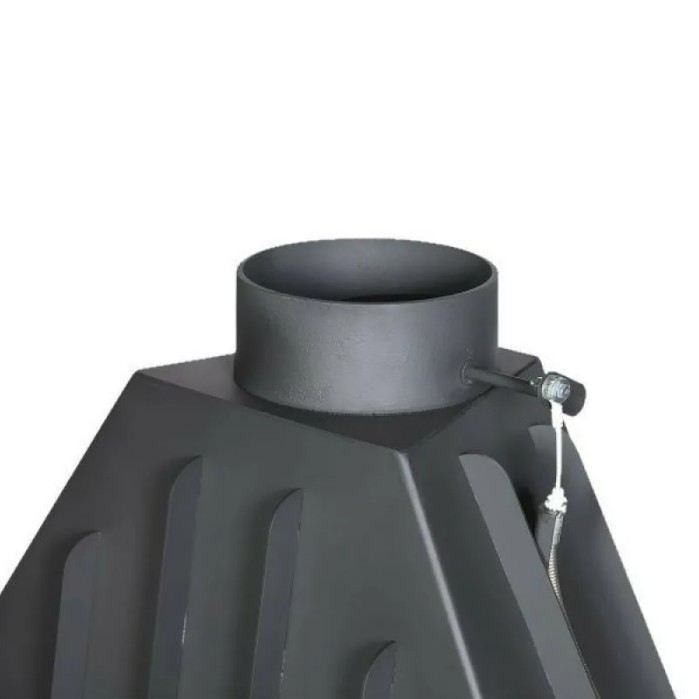 Дымосборник высокий и имеет форму конуса. Дымовые газы поднимаются вверх без завихрений и скапливаются в верхней части дымосборника. Когда вы открываете дверцу топки, чтобы подкинуть дров, то в помещение попадает на 80% меньше дыма. Топка с высоким дымосборником имеет чуть меньший КПД, но она удобнее в эксплуатации.
