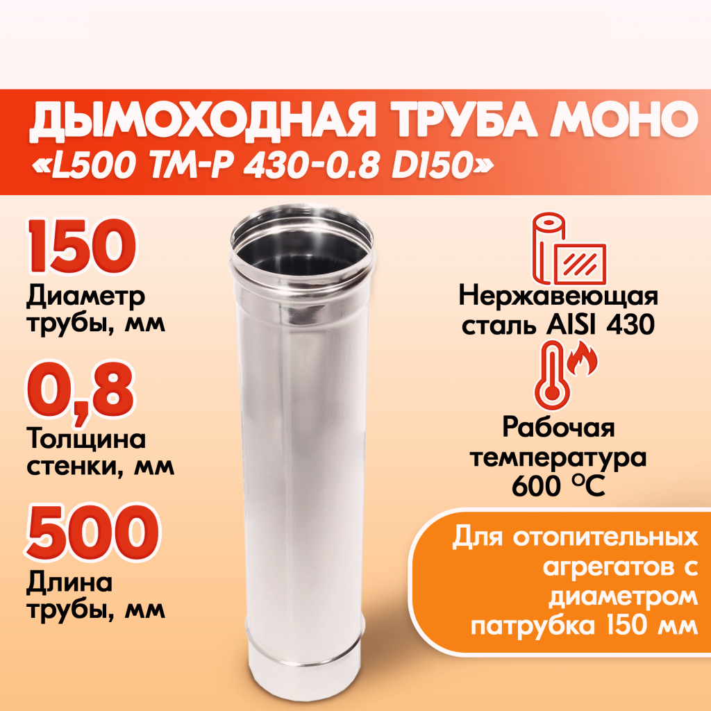 Трубы для дымохода из нержавейки L500 ТМ-Р 430-0.8 D150 для бани, газовый дымоход для котла и печная труба для отопительной печи